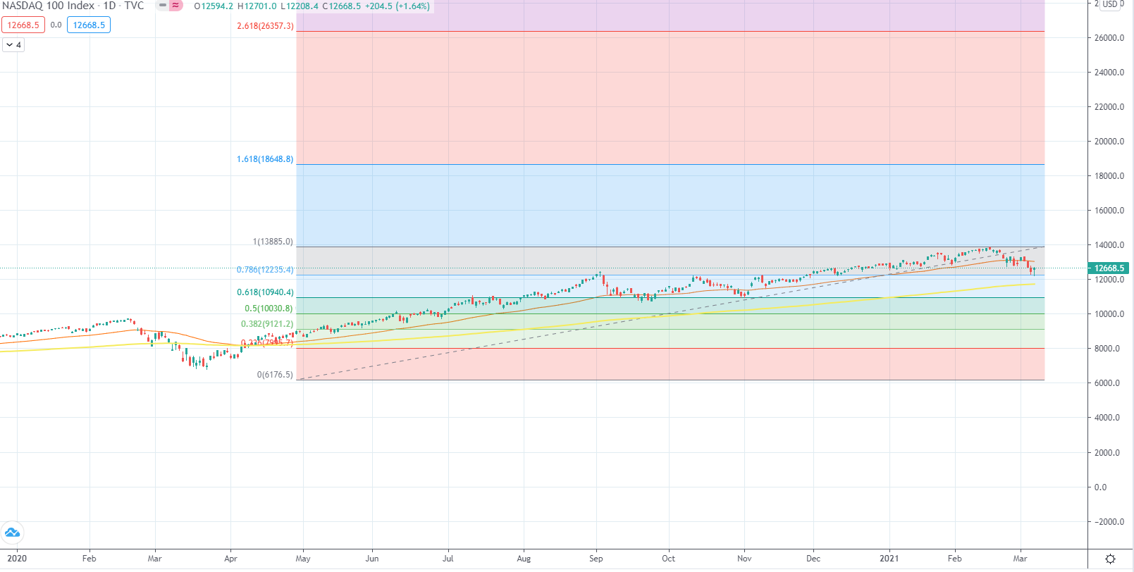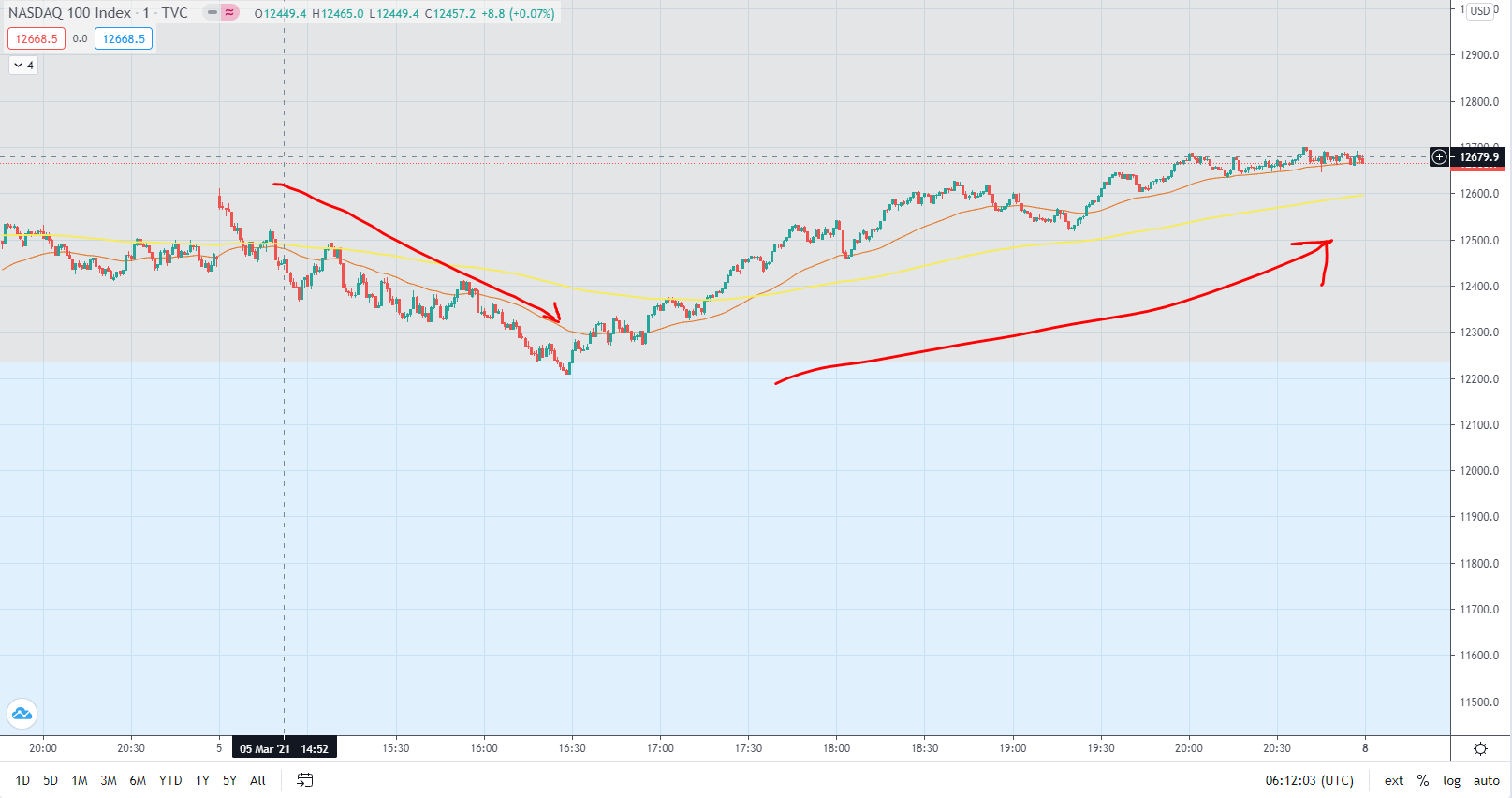 If you look at the Nasdaq 100 Index 1 year time frame, it has corrected around 12% from its peak (1- 12235/13885 = approximately 12%). If you zoom in the 1-day time frame as seen in the 2nd picture, this is what short-term volatility looks like. Last night was like a roller coaster. It must have resulted in a lot of retail investors been flushed out from the game due to margin calls or sell in panic.