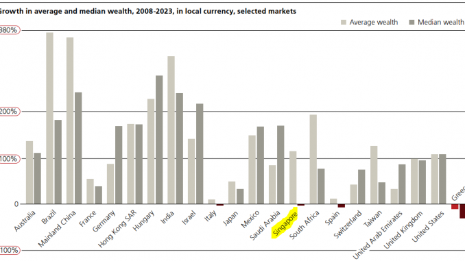 Many people feel the growth in wealth has passed them without them noticing. This is due to the difference between average and median wealth. In most markets average wealth in 2023 is higher than the median wealth per adult. The wealth figures are skewed up by high wealth at the top while median wealth is less distorted by tail-end figures. Singapore’s average wealth growth of 116% contrasts with a decline of 2% in median terms. Singapore is a safe regional wealth hub, attracting the ultra-rich and family offices to park their funds here. It will just skew the figures but does not add value to uplift the median wealth. The general population needs higher-skill jobs to increase their employment income.