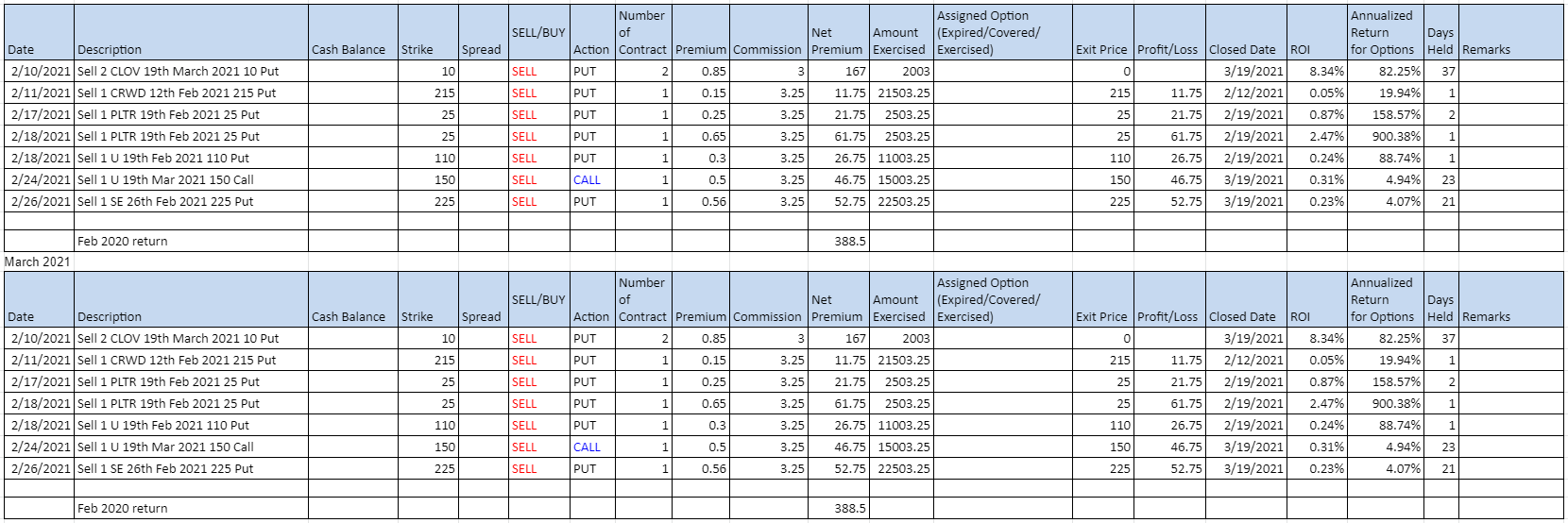 In February 2021, I sold PUT on CLOVER Health, this is a speculative play to support the small boy in the industry. Read it here for another story of David versus Goliath. Palantir and Unity are companies that I will like to own for the long term, I do not mind if they are exercised. Unfortunately, the share price of Palantir propelled from USD 24.6 to USD 28 last night. I sold a CALL on Unity after buying another 25 shares to make it 100 shares.
